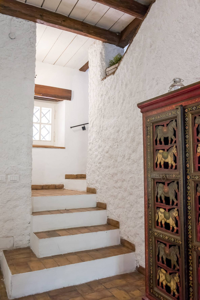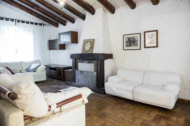 La struttura si sviluppa su due livelli: al piano terra si trovano un doppio salone con camino, cucina abitabile, disimpegno con bagno e studio;