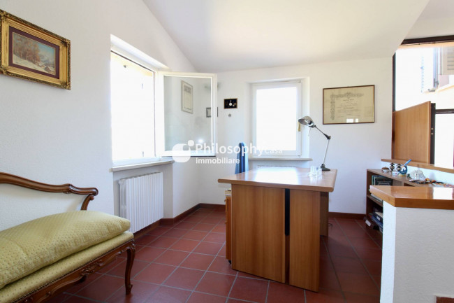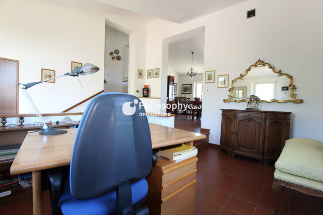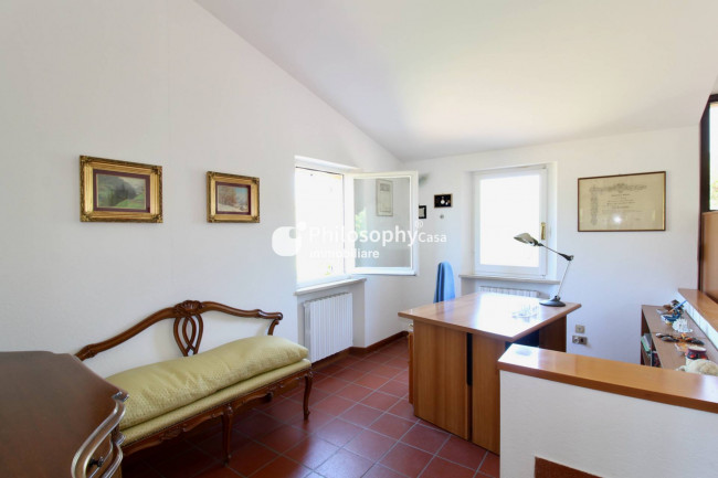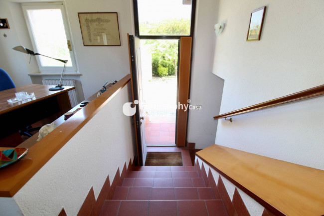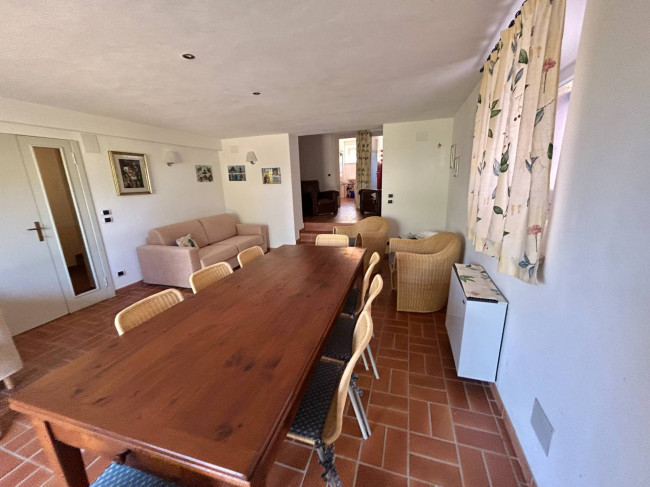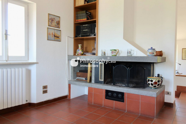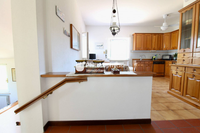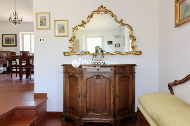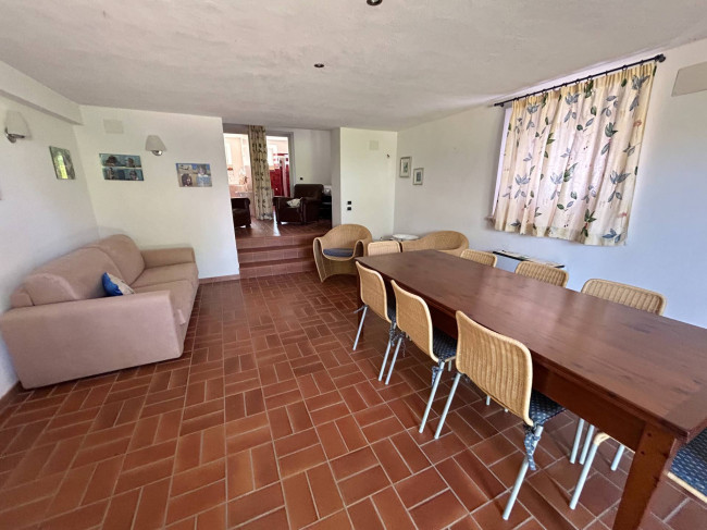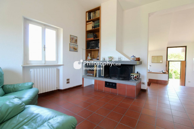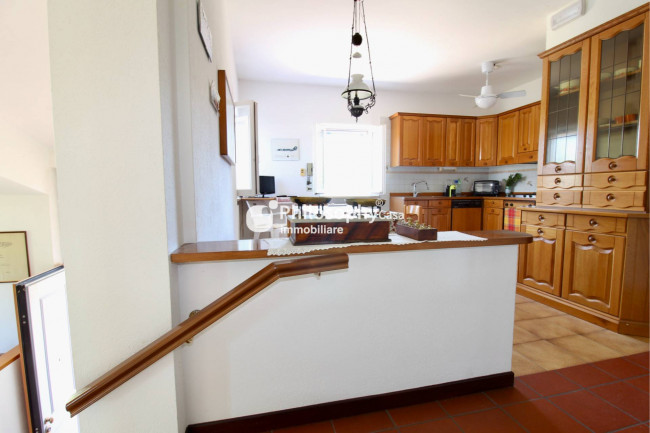 Piano superiore: spazioso salone con caminetto e vista mare, studio, cucina abitabile, due camere matrimoniali, terza camera e due bagni.