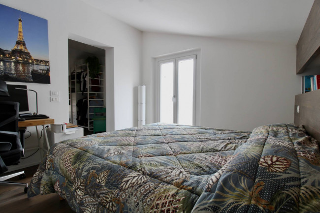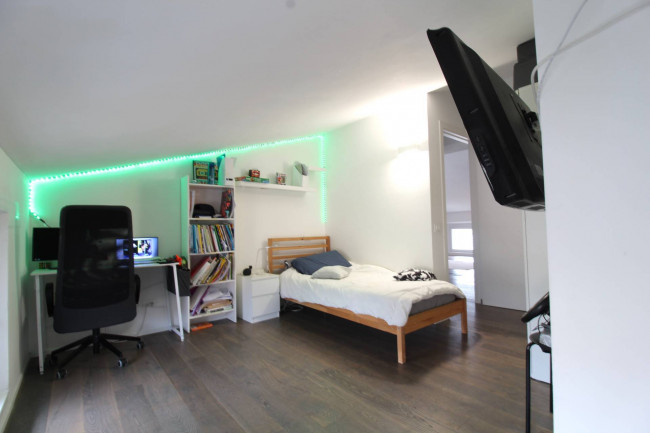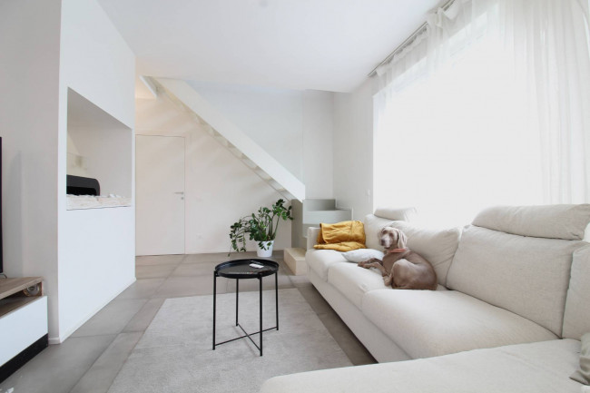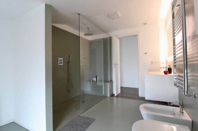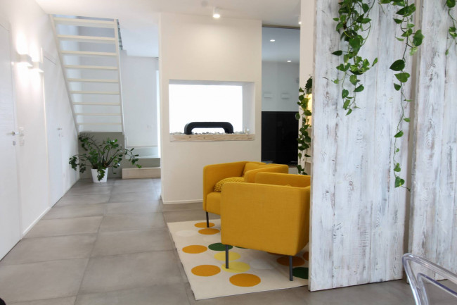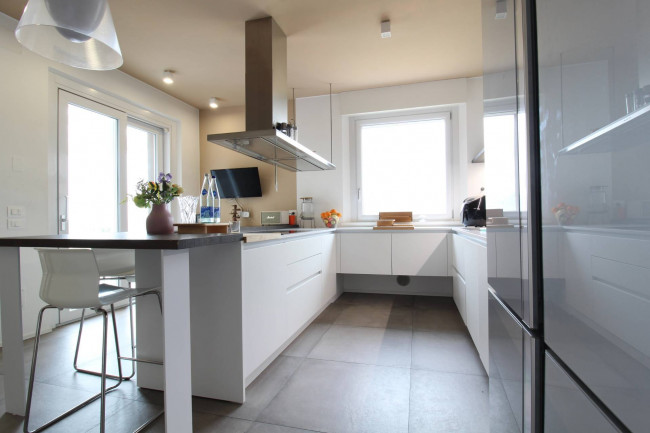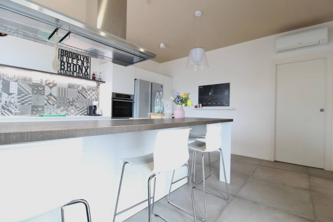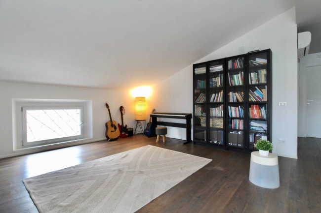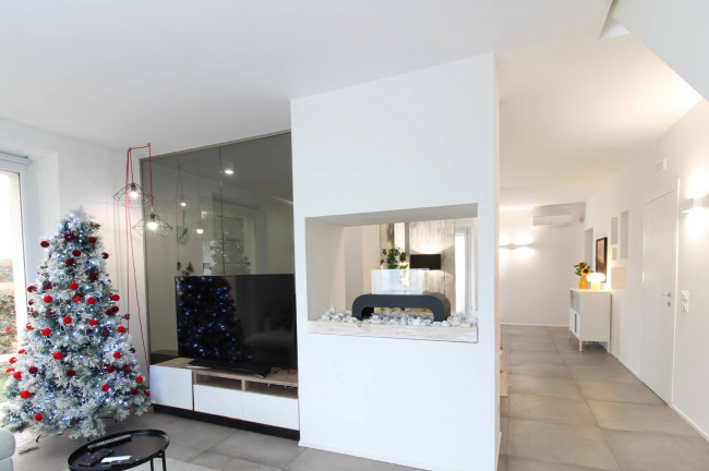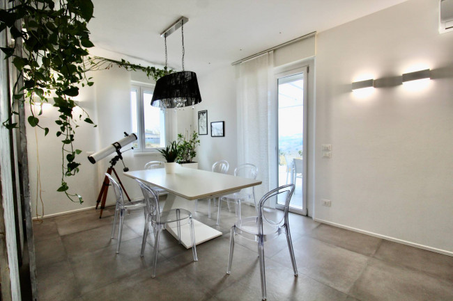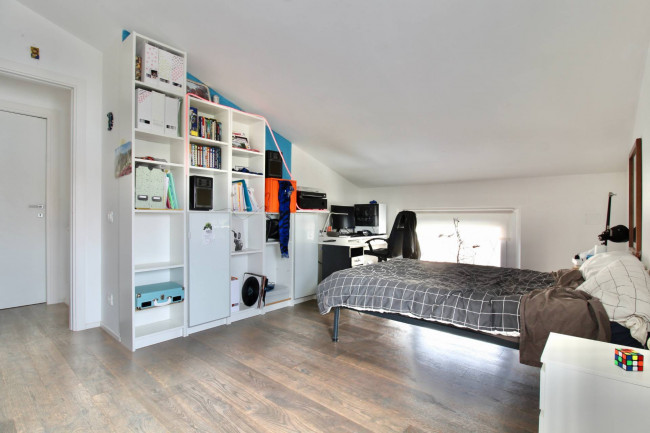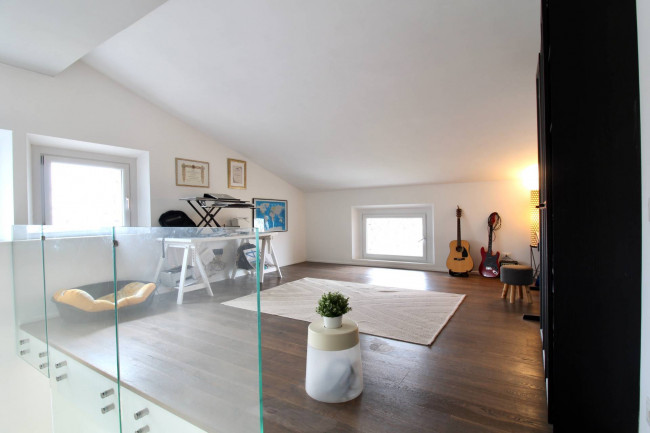 Al piano terra troviamo una grande zona living con caminetto a doppia faccia, elemento architettonico di forte impatto che dialoga con gli spazi circostanti, e una cucina di generose dimensioni con isola centrale, valorizzata da ampie vetrate che mettono in continuità interno ed esterno. Sempre allo stesso livello è presente una stanza attualmente adibita a palestra, completa di bagno, facilmente trasformabile in camera per ospiti o studio. Una comoda scala conduce al piano superiore, dove si apre una seconda zona living ideale come area studio o relax, una camera matrimoniale con ampia cabina armadio e accesso diretto alla terrazza panoramica, oltre a due ulteriori camere e due bagni.