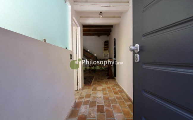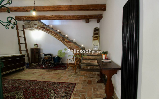L'ingresso si apre al piano terra su un ambiente dal fascino autentico, caratterizzato da pavimenti in cotto, travi in legno e una suggestiva scala in pietra. Uno spazio oggi utilizzato come disimpegno, ma estremamente versatile: ideale come studio, area hobby o zona relax.